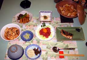 すき焼き(鍋),煮物,サラダ(数の子マヨネーズ),まぐろの山芋とろろかけ,鱒の塩焼き,きんぴら,漬物(キムチ風味)