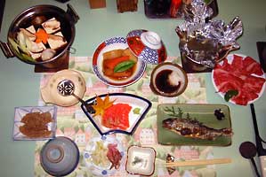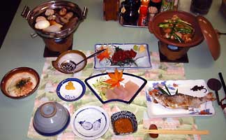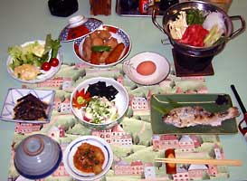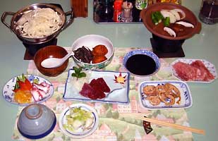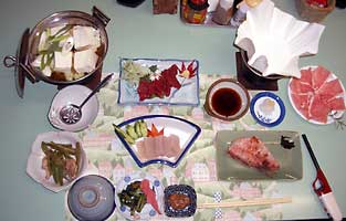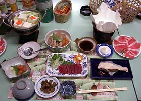 馬刺,豚のしゃぶしゃぶ,鮭の粕漬け,煮物(インゲン,蓮根,コンニャク,厚揚げ),鍋(豆腐,ねぎ,白菜,にんじん) ,明太子と大根おろし,漬物(きゅうり)